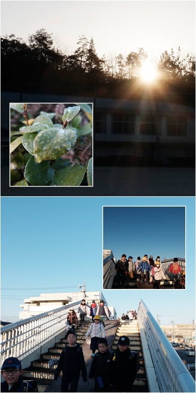 今は,登校時刻の少し前,7時35分ごろ幡山東小に日が昇ります。この時間,冷たい風が吹き一番冷え込んでいました。椿の葉に降りた露が凍っていました。真っ青な空,張りつめた空気の中,元気に登校です。