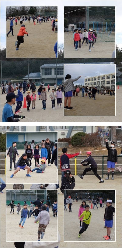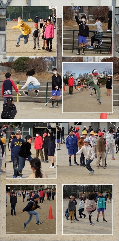 なわとび集会≪正面くぐり と 正面跳び≫ 公開日 2019/01/21 更新日 2019/01/21 日々のページ 今日は正面からなわをくぐり抜けていきます。これは跳ばなくてもよいのでタイミングをとれるようになるとみんなスムーズに抜けられるようになっていきました。 次に下から向かってくる長縄を跳んでくぐります。タイミングをとるのがなかなか難しいです。低学年の子と手をつないで跳んだり,タイミングよく背中をおしてあげたりする姿が見られました。 いいね(0)