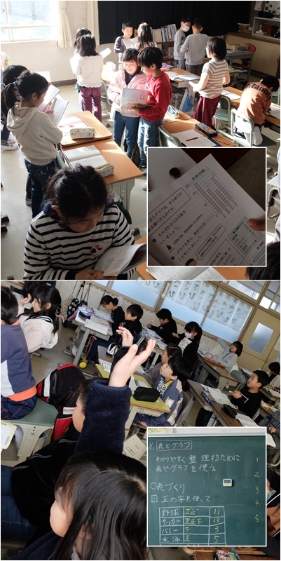 3年生授業の一こま 公開日 2019/01/21 更新日 2019/01/21 3年生 2組は国語の学習です。お気に入りの詩を集めて詩集をつくっています。 1組と3組は棒グラフの学習をしています。棒グラフの読み取りについて学習をしています。 いいね(0)