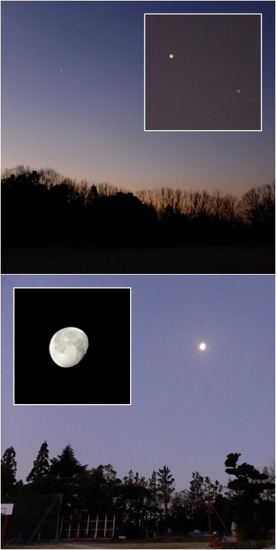 今朝も南の空には二つの星が輝いていました。調べてみると明るい星が金星,暗い星が木星でした。空気が澄んで月も一段と輝いてみえます。