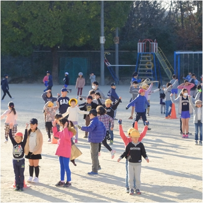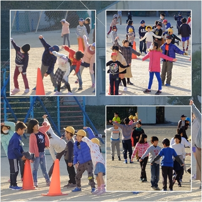 縦割りグループの場所にやってきた子からラジオ体操が始まります。