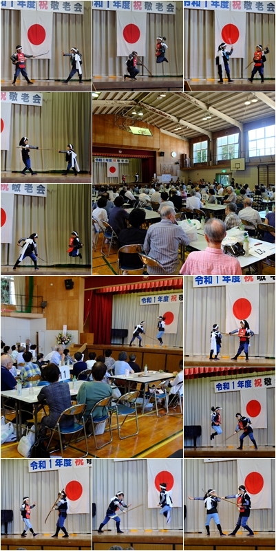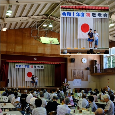 3連休のなか日,15日に体育館で地域の敬老会が開催されました。代表の児童がお祝いのあいさつをしました。また,棒の手を学んでいる子たちが演技を披露しました。どちらも大きな拍手をいただきました。当日は暑く,5・6年生が制作したうちわを早速使ってみえる方がたくさんみえました。