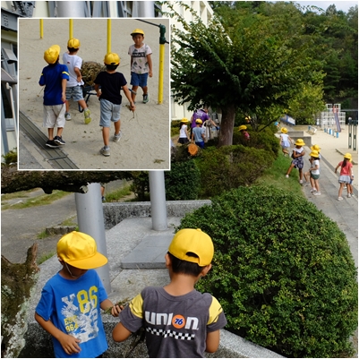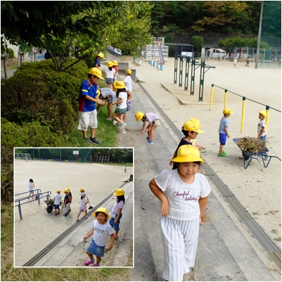 刈りこんだ植栽の枝を,1年生が一生懸命集めてくれています。