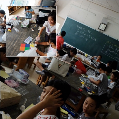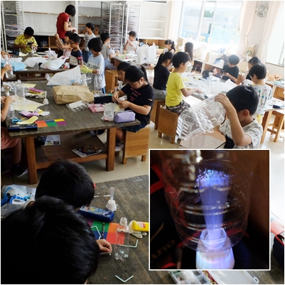 はさみやカッターナイフを使ってペットボトルをくりぬいたり切ったりして,光のオブジェをつくっています。