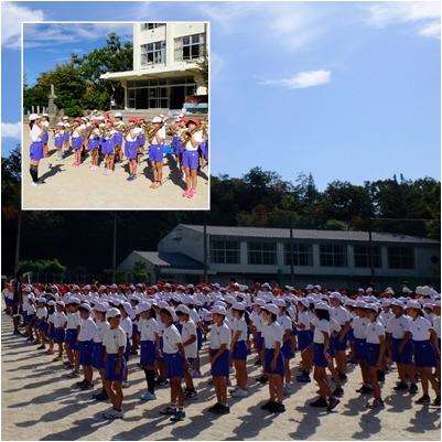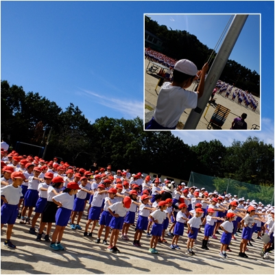 午前8時55分,予行練習が始まりました。校歌に合わせて校旗が揚がります。