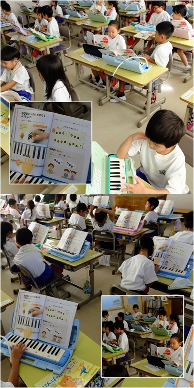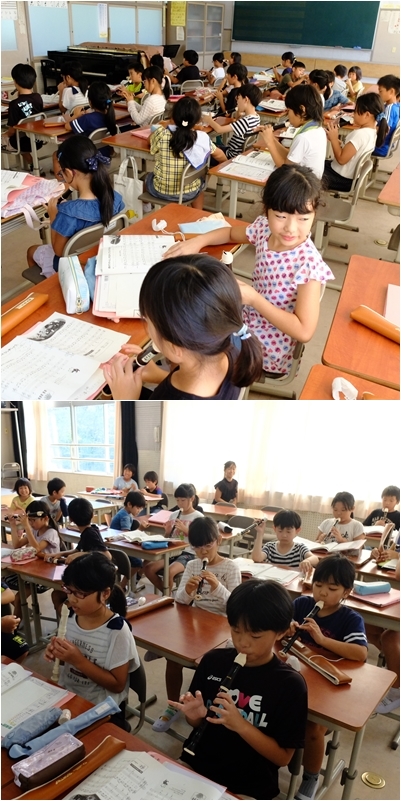 楽器の演奏の授業です。1年生はけん盤ハーモニカ,3年生はソプラノリコーダーの練習をしていました。