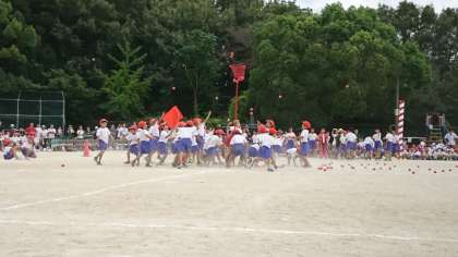 最初は女子、次に男子、最後に全員で赤組 白組 それぞれのかごに玉入れをしました。初めての運動会、一生懸命 そして楽しそうに、赤も白も たくさん玉を入れていました。