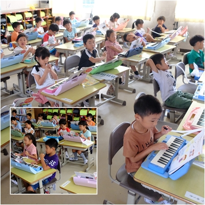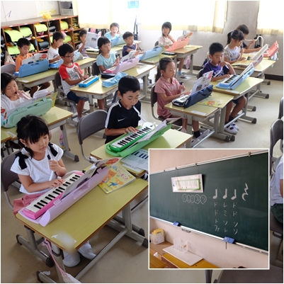 1年生がけん盤ハーモニカの練習です。ずいぶん上手になりました。