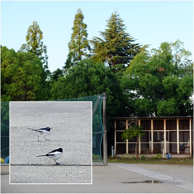 つがいの小鳥が雨上がりの水たまりにやってきました。仲良く散歩しているようでした。