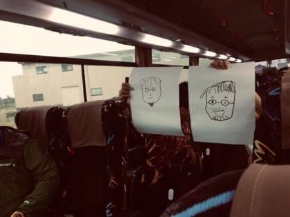 修学旅行その11『奈良市街にむかって』 公開日 2019/10/24 更新日 2019/10/24 6年生 本降りの雨の中、奈良市街にむかっています。バスレクをしています。さて誰の似顔絵でしょう? いいね(0)