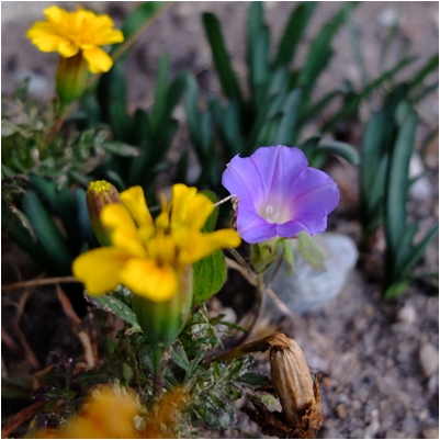 花壇でマリーゴールドと親指の先ほどの朝顔が並んで咲いていました。