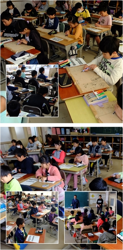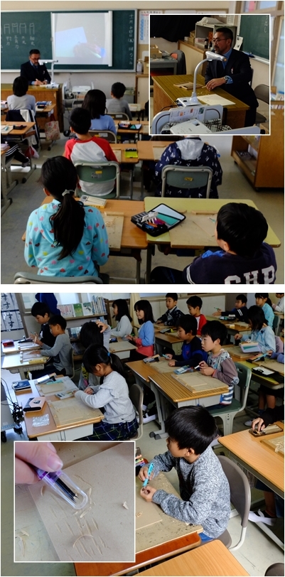4年生は初めて木版画に挑戦します。今日は彫刻刀の使い方について,専門の先生から学べる貴重な時間でした。今日学んだことをいかして,けがすることなくすてきな作品を仕上げられるとよいですね。