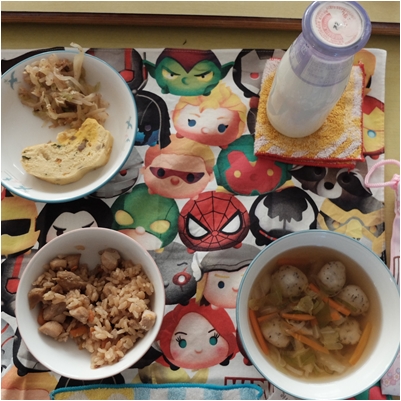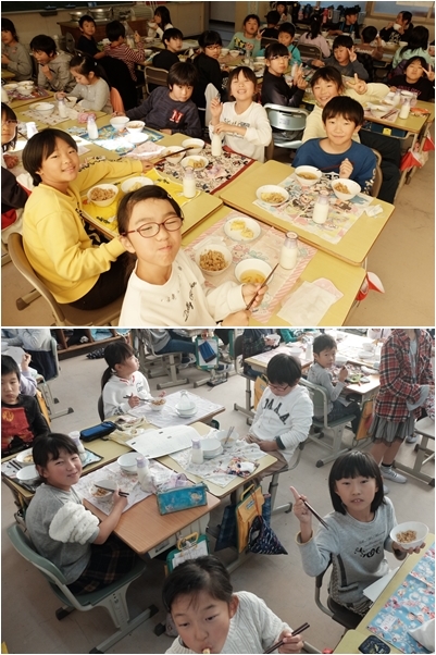 今日は,愛知の五目厚焼き玉子が登場しました。とりめし,あかもくのつみれ団子汁,キャベツのおかかあえとともにおいしくいただきました(写真は3年生です)。