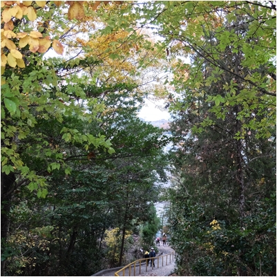 この時期,色づいた木々のトンネルを抜けて登校です。