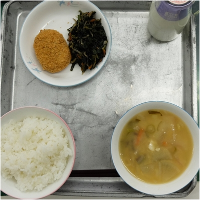 今日の給食は,呉汁,さつまいもコロッケ,ほうれん草のひじきあえ,ごはん,牛乳でした。大豆をすりつぶしてペーストにしたもの「呉」が,みそ汁にたっぷり入っています。野菜もたっぷりと入ってとてもおいしいです。