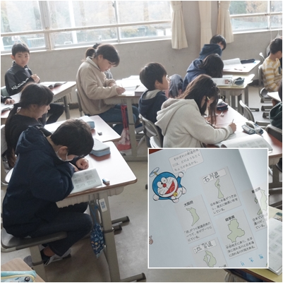 都道府県の形と特産物などのちょっとしたヒントを参考にして都道府県名を答えます。形だけですんなり答える子もいますが,実際,都道府県を形で学んでいない世代にとってはかなり難しい問題です。