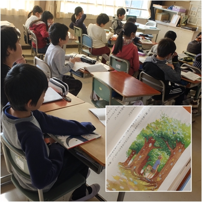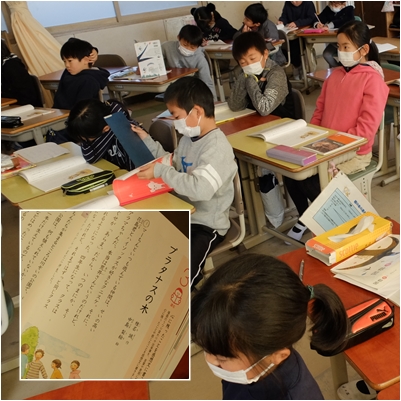 3時間目は,国語の授業でした。物語「プラタナスの木」,すてきな挿絵が載っています。心に残ったことを一文にまとめます。