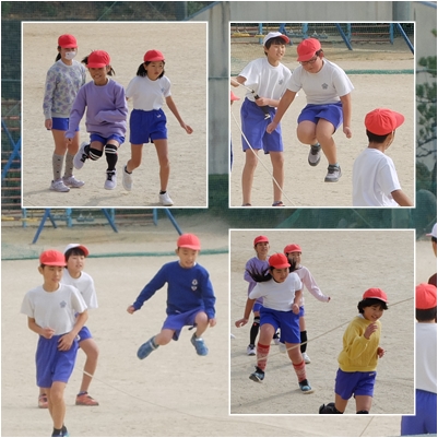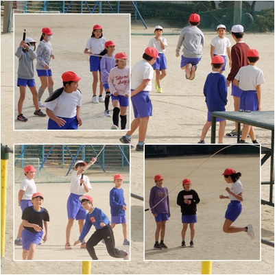 日差しがあたたかです。欠席が少なめの5年生,体育の授業で大縄の連続跳びに挑戦していました。