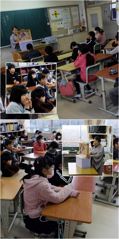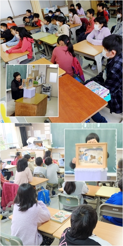 地域の方による読み聞かせ,2学期最後の日は4年生でした。残念ながら一クラスは学級閉鎖でしたが・・・。二クラスで紙芝居をしていただきました。