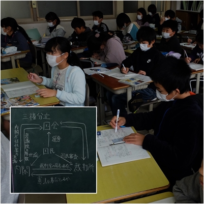 今日は「三権分立」の学習です。おなじみの「国民と国会(立法)・裁判所(司法)・内閣(行政)」の関係図が板書されています。