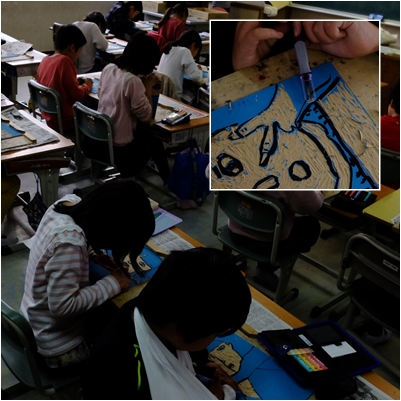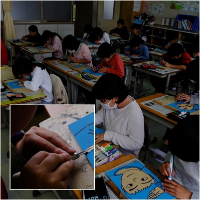 彫刻刀に両手を添える。これが一番のけが防止の技。みんな集中して作品づくりに取り組んでいます。自然と声も出なくなります。とても静かな教室です。