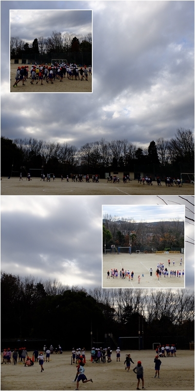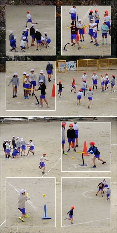 変則ルールで守備側は誰かがボールをとると全員が走ってサークルに入ります。そのタイミングでアウト・セーフが決まります。攻める方も守る方も懸命に走っています。運動量も稼げる,寒いこの時期にぴったりのルールです。