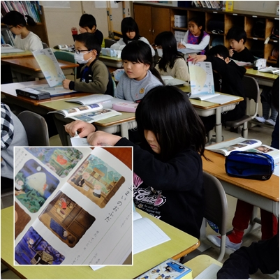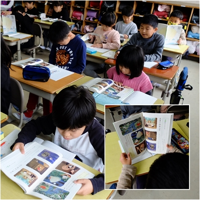 むかしばなし「三まいのおふだ」の朗読を聞き,教科書の挿絵を観ながらお話を聞いています。聞いたことを正しく理解する力を伸ばす学習です。