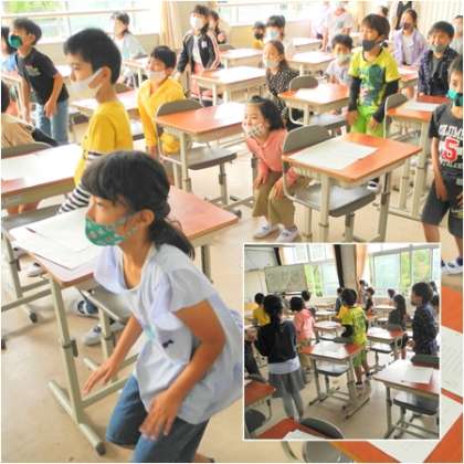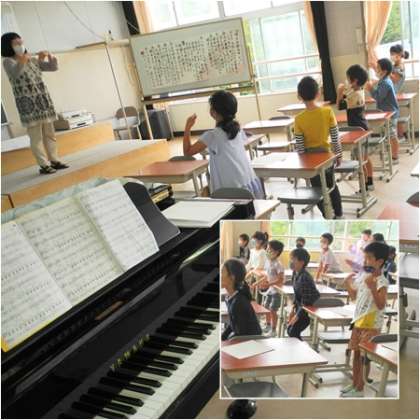 今日は音楽室で授業です。リズムに合わせて身体表現です。この後,元気な歌声が響いてきました。