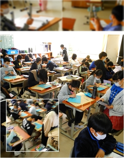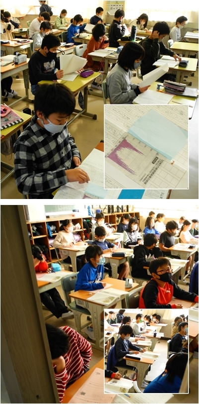 5年生は。資料をつかってまとめたレポートの回し読みをして,それぞれのよいところをみつけています。