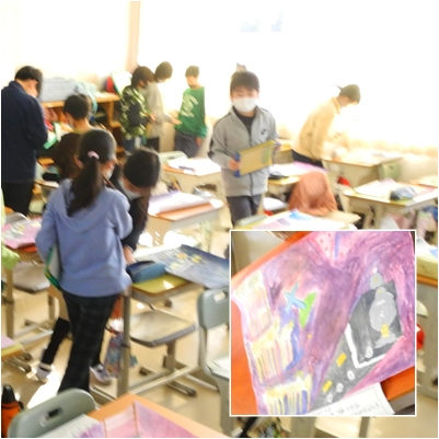 5年生:図工 公開日 2020/12/10 更新日 2020/12/10 5年生 宮沢賢治の物語「銀河鉄道」を絵に描きました。 今日は,作品鑑賞です。それぞれの絵のよいところ探しをしています。 いいね(0)