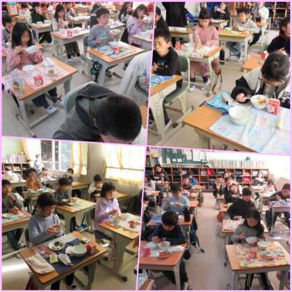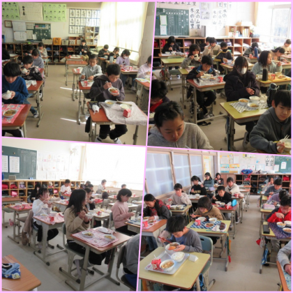 見た目、味、栄養のバランス、いろいろ考えられている給食。味わっていただいています。