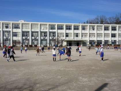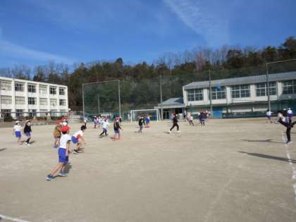学年体育です。タグラグビーをする予定でしたが、接触を避けるためにドッジボールに変更しました。ボールの回し方を工夫しているチームもありました。