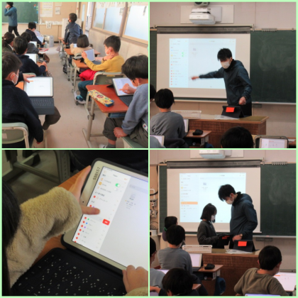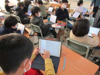 3年2組です。あと少しで3年生が終わるので、タブレット端末の中の情報を整理していました。スクリーンに映した端末を指さして、「ここを押してね」と先生が説明しています。「先生、これでいいですか?」と確認している子もいました。