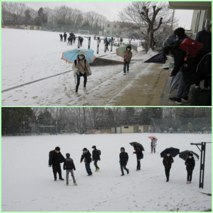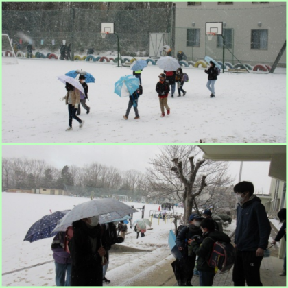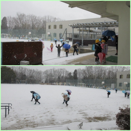 急に振り出した雪が、運動場が真っ白になるほど積もり、雪の中の登校となりました。子どもたちの多くは雪を見るとワクワクしますが、大人はドキドキしますね。