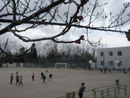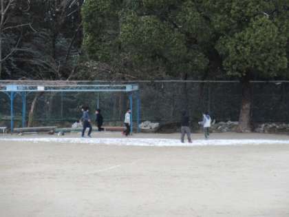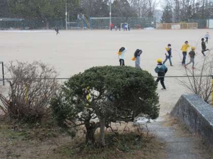 昼放課、わずかに残った雪で遊ぶ子どもたち。放課が終わる頃になって、急にまた雪が降り始めました。残念ながら放課はおしまいです。惜しみながら、教室へ戻る子どもたちでした。