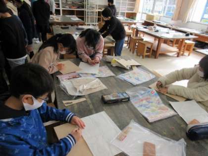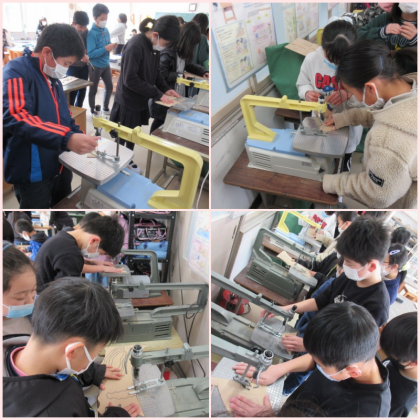 5年1組の図工です。板に下絵を描いて、電動糸のこぎりで切っていきます。曲線を切るのは、なかなか難しいのですが、とても上手に線の上を切っている器用な子もいました。切った板を組み立てて、立体作品を作ります。