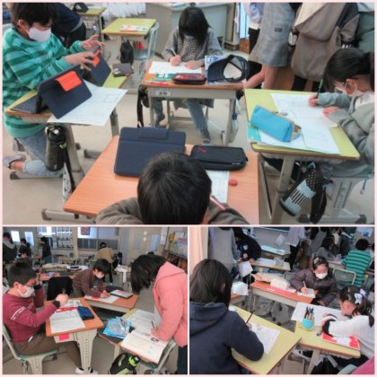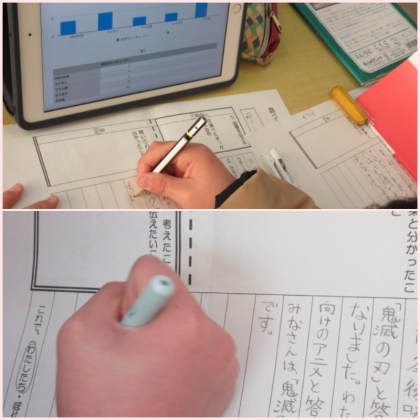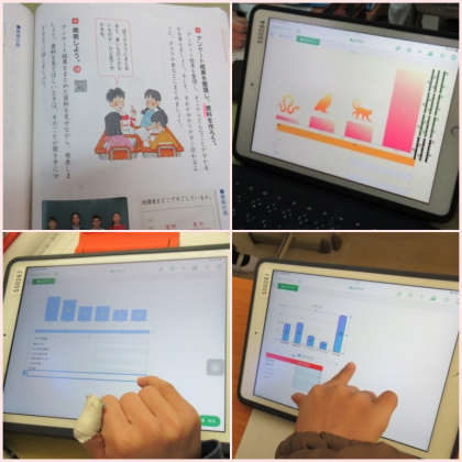 4年3組の国語です。アンケート調査の結果をまとめ、発表に向けて原稿作りと役割分担をしていました。以前は苦労して手でかいていた棒グラフ。タブレットを使えば簡単に、しかも色鮮やかに、わかりやすい棒グラフが作成できます。グラフ1つにも、子どもたちの個性や伝えたいことが現れます。きっとすてきな発表ができることでしょう。