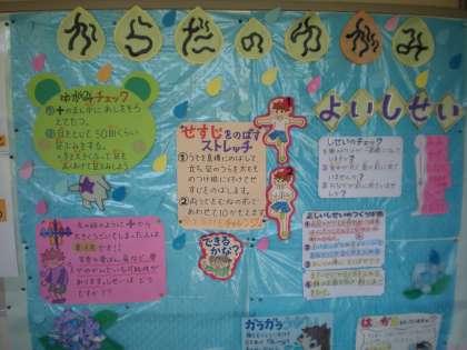 掲示物の前で、ゆがみチェックを試している子や背筋をのばすストレッチに挑戦している子が多くいました。