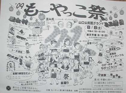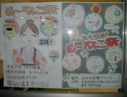 公民館の玄関に、8月8日(土)に開かれる「もーやっこ祭」のポスターが掲示されていました。