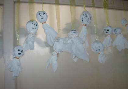 1年生の教室に、かわいらしい「てるてる坊主」がたくさん作ってありました。