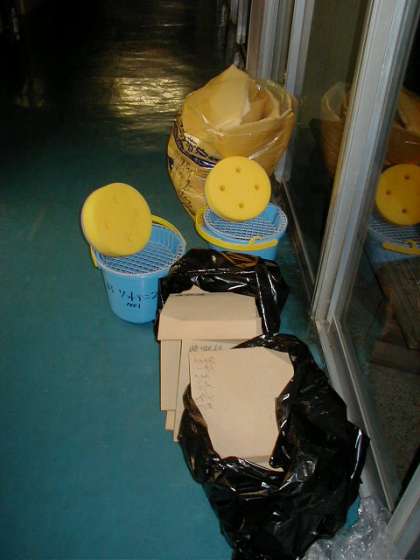 下の写真は、中学校から借りた水を吸い取り用のスポンジです。これを使って、子どもたちが活動できるように運動場の整備を行います。