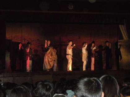 高学年は、太宰治の「走れメロス」を観劇しました。迫真の演技にみんな息をのんで役者さんを目で追っていました。ラストシーンでは、子どもたちの中をメロスが走り抜け、子どもたちもストーリーの中に入り込んで見入っていました。