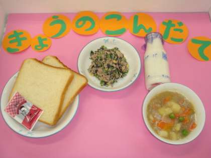 私の顔を見ると「はっ!」と気づいてピン!と姿勢を正して、食器を持って食べる姿が見られました。おうちでも、少し気をつけて食べてくださいね。