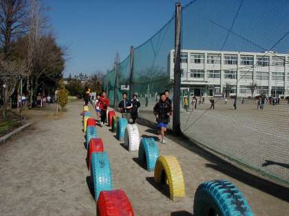 森の教室では1年生が「はじめの一歩」、体育館周辺では3年生や5年生が「かくれんぼ」、運動場では2年生をはじめ各学年の子がサッカーやドッジボールの球技、縄跳び、一輪車、鬼ごっこ、そして4年生はクラス対抗のフリスビードッジ…みんなで楽しそうに遊んでいます。そして、その周りを今日も6年生が「東京マラソン」。