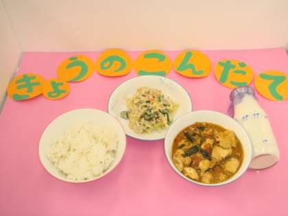今日は、マーボー豆腐。給食のマーボー豆腐は、赤みそで作ります。市販のマーボー豆腐とは少し違いますが、子どもたちはご飯にかけたりしておいしそうにほおばっていました。中には、ネギが苦手な子もいましたが、一生懸命挑戦して全部食べていました。