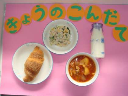 今日は、ポークビーンズでしたが、1年生と4年生、5・6組さんは社会見学でした。