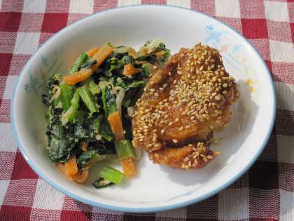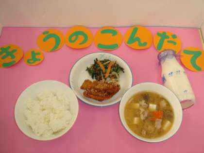 下の写真は、子どもたちに人気のある「鶏肉のてりかけ」です。「この味付けが大好き!」という子が多いです。U