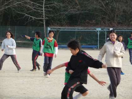 先制点は、先生チームが入れたため、6年生チームが燃え上がり、激しい戦いとなりました。(画像2)見学をしている4年生、5年生はサポーターとなり、先生達に鋭く、厳しいアドバイスを飛ばしていました。温かい声援を受け、先生達は、精一杯の力でボールを追いかけました。