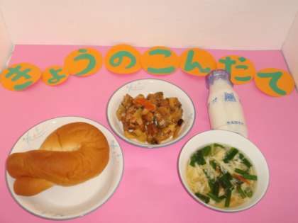 ※しいたけを苦手にしている子が多いと聞きます。きょうは、揚げマグロの味にも慣れていなかったことが苦戦の原因としてあるかもしれません。ニラのたくさん入ったスープはどうだったでしょうか?U