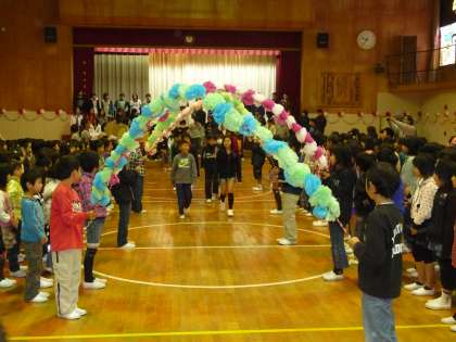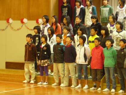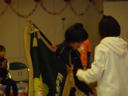 写真左:6年生の様子、中:校旗引き継ぎの様子、右:退場の様子です。